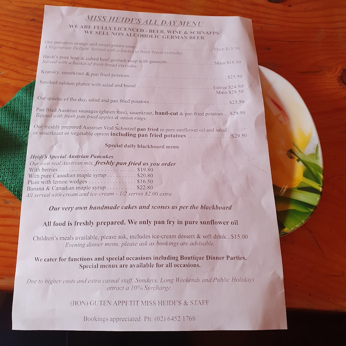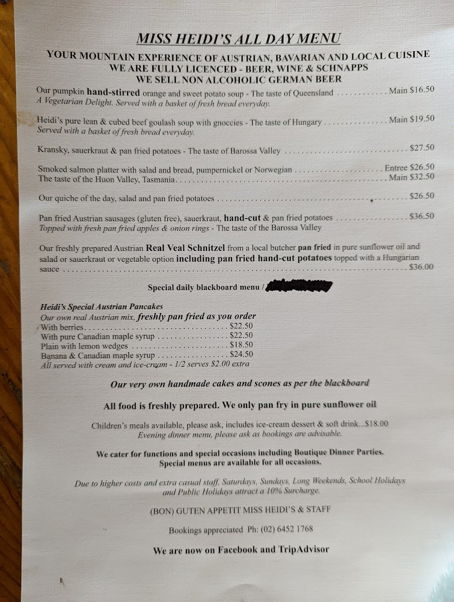 Welcome to Miss Heidi's Tea House, a delightful cafe nestled at Mt Gladstone Lookout in Cooma, NSW. Known for its homemade European-style cuisine, the menu is a treasure trove of comforting dishes that pay homage to traditional recipes. Guests rave about the Heidi's Pure Lean & Cubed Beef Goulash Soup with Gnocchi, often hailed as one of the best around. You won’t want to miss the apple strudel, a crowd favorite, served warm with ice cream and cream, embodying the essence of homemade goodness.