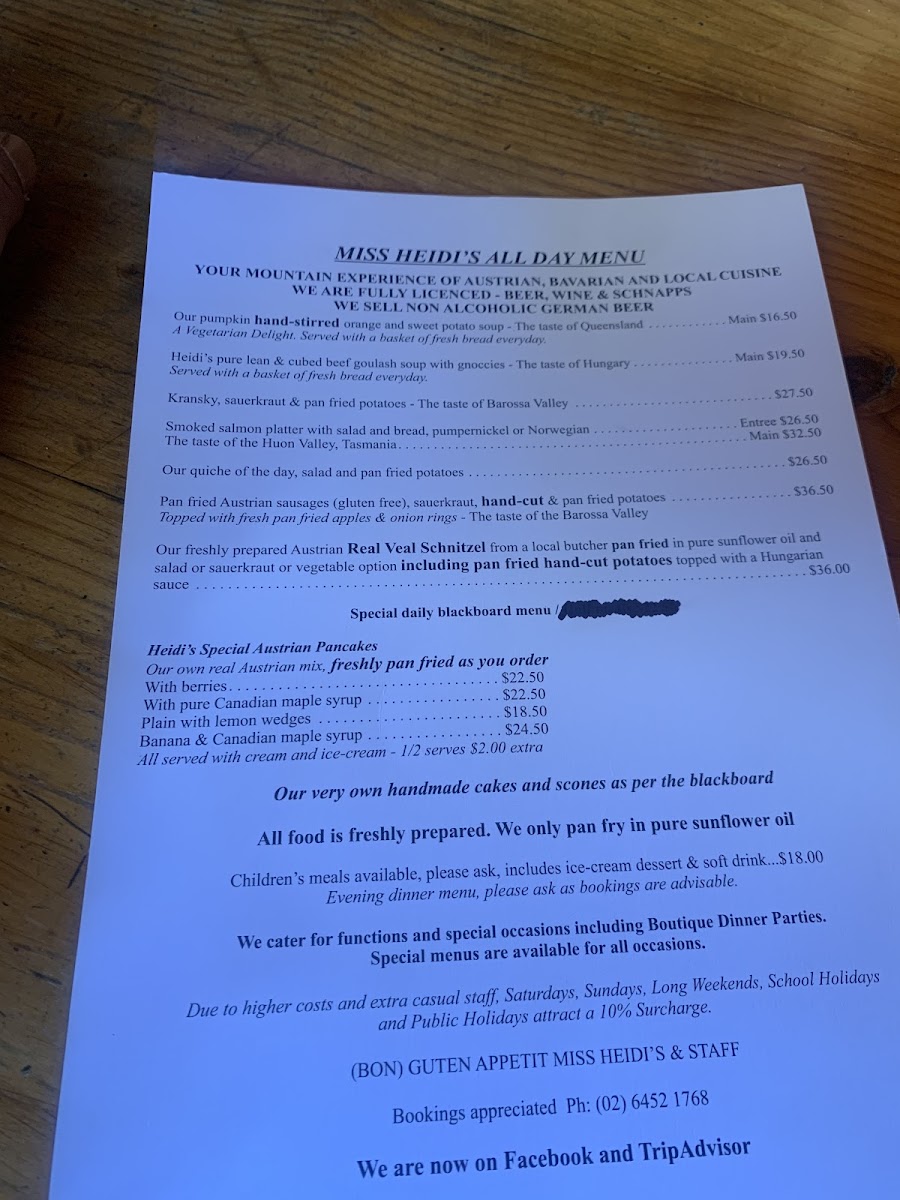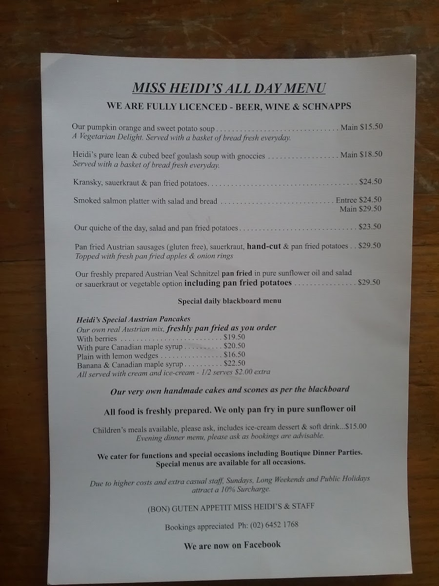 The menu also features options like smoked salmon platters, pumpkin hand-stirred orange soup, and Austrian sausages. Each dish reflects a commitment to quality and flavor, with every bite reminding you of home-cooked meals. With friendly service from the dedicated team, dining at Miss Heidi's feels like sharing a meal with family. Stop by and indulge in their renowned offerings—you won't regret it!